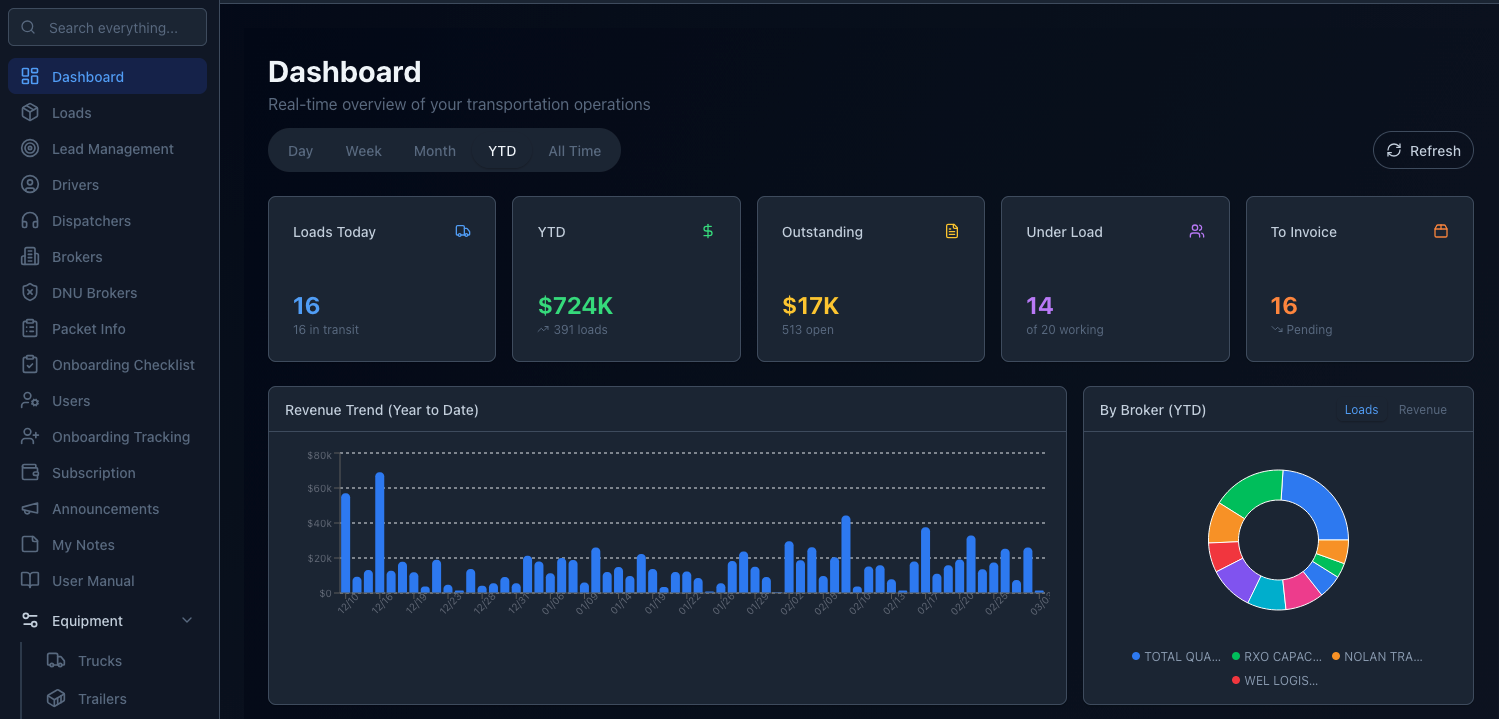 Manage loads, drivers, and equipment from a single intuitive dashboard with real-time updates and company overview.